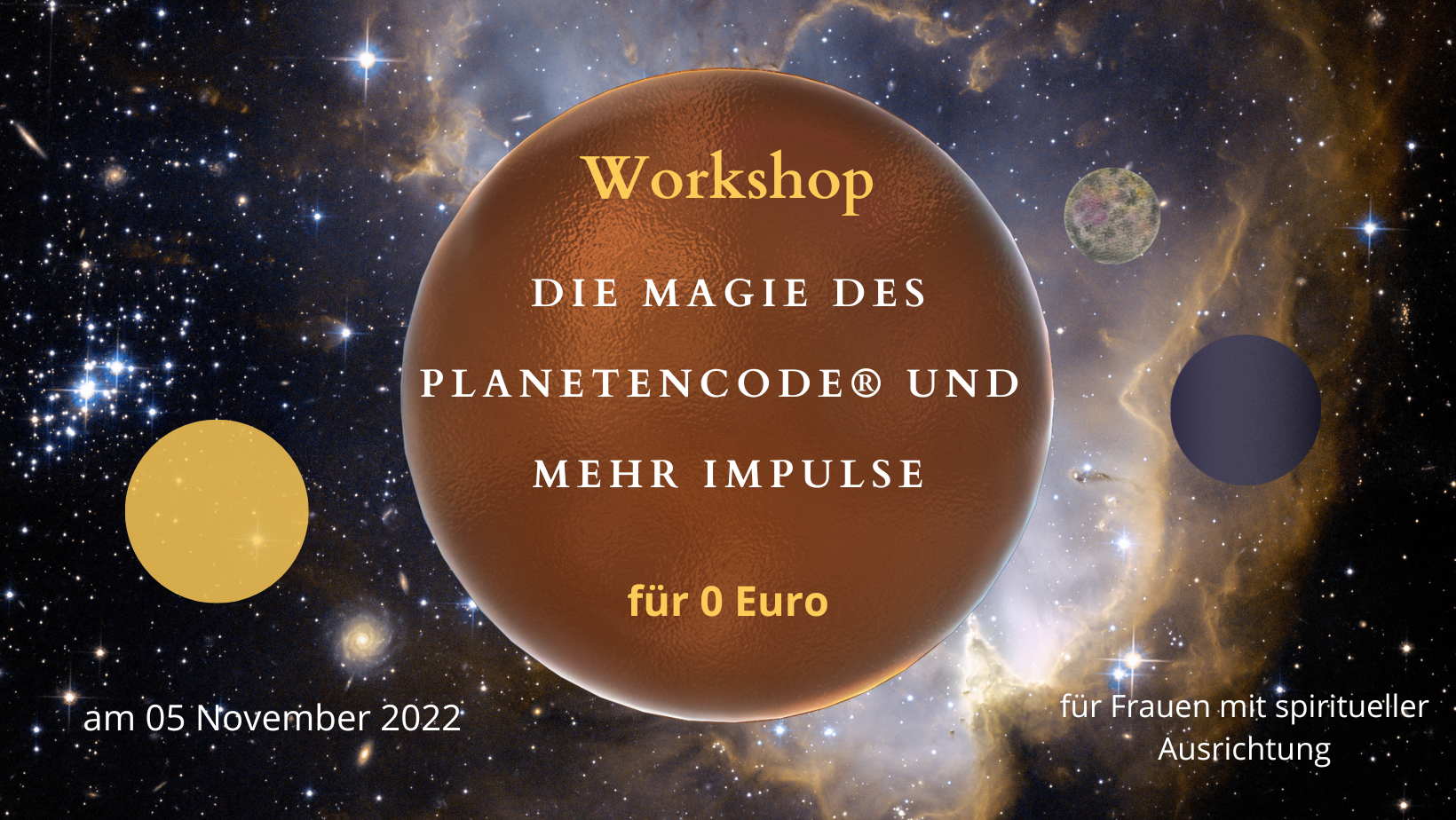 Du kennst die Astrologie aber vom PLANETENCODE® hast du noch nichts gehört oder du hast schon davon gehört und kannst dir aber trotzdem noch nicht so richtig etwas darunter vorstellen? Dann komm zu mir in den Workshop, denn da zeige ich dir was es mit dem PLANETENCODE® auf sich hat und wie du durch ihn zur Selbsterkenntnis und Klarheit kommst.